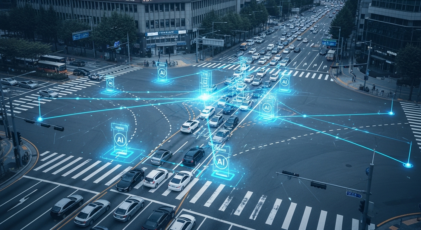 서울 도심의 번화한 교차로에서 AI 기반 스마트 교통 시스템이 차량 흐름을 분석하고 꼬리물기 등 위반을 감지하는 모습. AI가 교통 안전과 효율성을 높이는 장면을 보여준다. 🌐 '과학기술관계장관회의' 부활과 국가 AI 대전환 전략