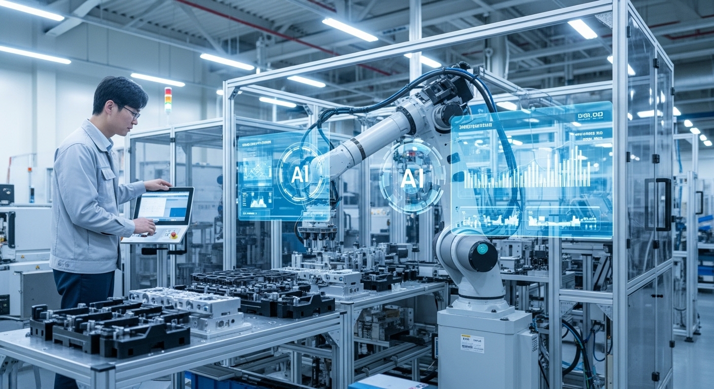 한국의 현대적인 공장 내부에서 로봇과 AI 기반 기계가 정밀하게 제품을 생산하는 모습. 사람이 이를 감독하며 AI 스마트 제조 혁신을 보여준다. 🤝 글로벌 협력을 통한 'AI 기본사회' 선도