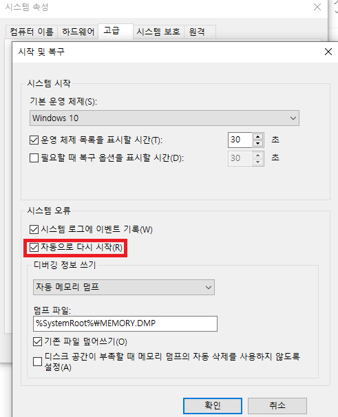 블루 스크린으로 인한 출동을 방지하기 위해 다시 시작하도록 설정되어 있으면 어떠한 이유로 인해 충돌하여 재부팅될 수 있습니다. (종료 시점에) 그래서 자동으로 다시 시작 확인란의 체크를 해제해 주셔야 합니다.