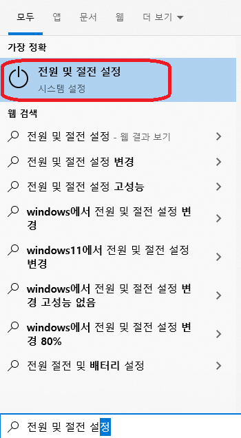 이번에도 Window 키를 누르시고 "전원 및 절전 설정" 치시면 아래와 같은 그림이 보이실 것입니다.