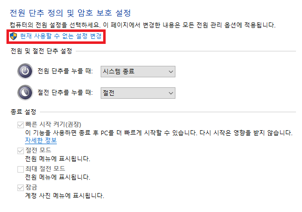 "현재 사용할 수 없는 설정 변경" 클릭하면 아래 하단 비활성화되어 있는 체크 박스가 비활성화가 해제될 것입니다.