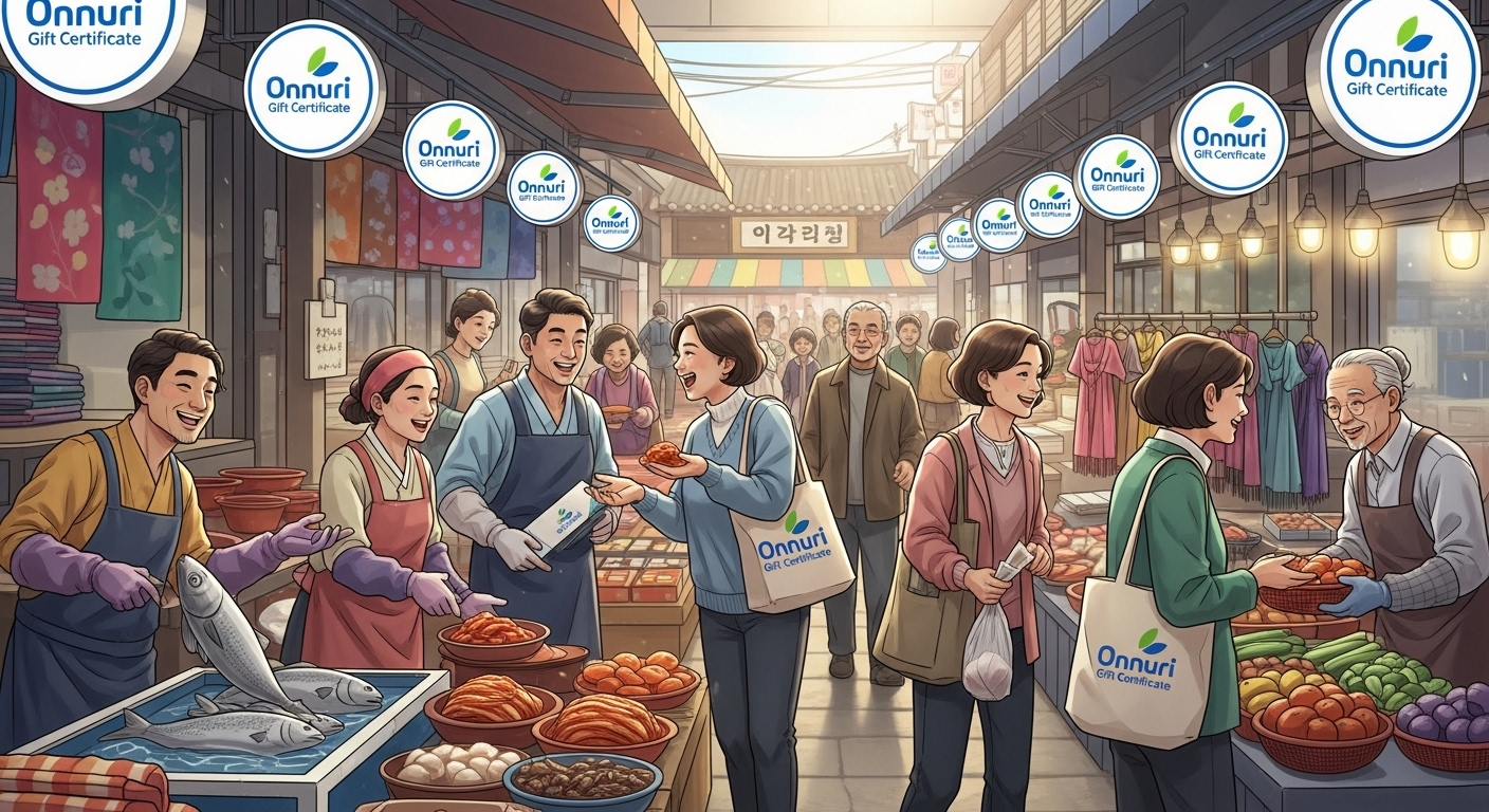 2025년 연말, 디지털온누리상품권으로 활기찬 소비를 즐기는 사람들이 전통시장과 상점에서 활기차게 쇼핑하는 모습, 정부의 상생페이백 정책으로 지역 경제가 활성화되는 모습을 표현. 🎁 2025년 연말, '상생페이백'이 다시 돌아왔어요!