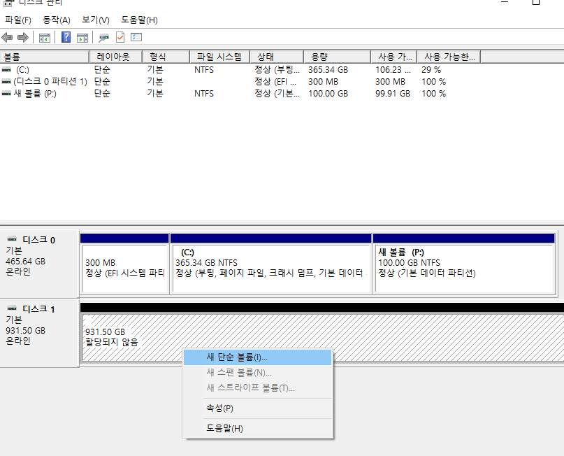 그러면 "오른쪽 마우스" 클릭 후 "새 단순 볼륨" 클릭하여 할당하여 주시면 되십니다.