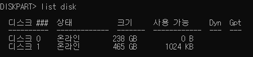 - diskpart 창에 'list disk' 명령어를 입력