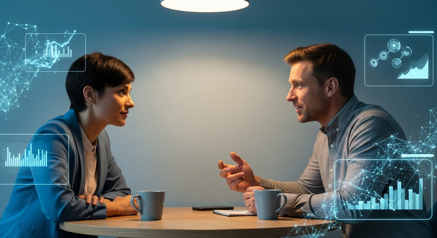 서로 마주 보고 진지하게 대화하는 두 사람 미래를 위한 핵심 역량과 전략 💪