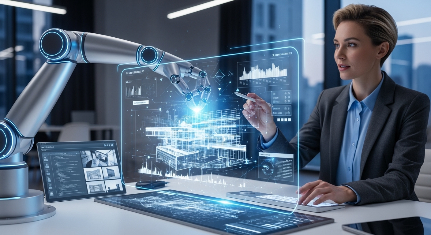 AI 시스템이 건축가의 홀로그램 설계 작업을 돕는 모습 2025년, 사라지거나 진화하는 직업들 🔄