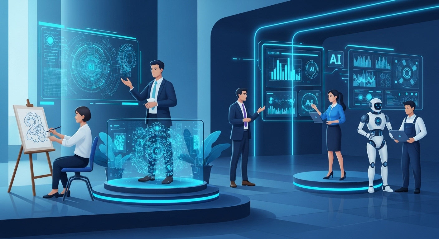 AI 기술과 협력하며 일하는 다양한 직업군 사람들의 모습 AI, 일자리의 지형을 어떻게 바꾸는가? 🤖